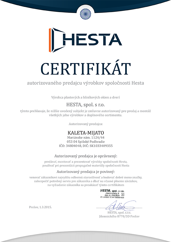 Certifikovaný predajca okien a dverí od spoločnosti HESTA, spol. s r.o.
